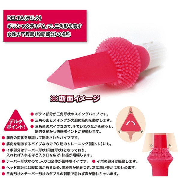 形状を三角にすることにより、イボやヒダ形状を超えた感触を得られるバイブです。刺激を変化させたいときはバイブを少しひねるだけで大きく変化させることができ、思わず声が漏れます。バイブはスイングタイプで三角形の角がウネウネと動作します。ヘッド部分には縦に溝があるため、潤滑液が絡みつき、常に潤い豊かに楽しめます。イボ部分はテーパー形状(円錐形状)となっており、入れれば入れるほど感覚が増幅します。本体サイズ:24.0×Φ3.5cm電池:単3×2パッケージサイズ:26.0×11.1×7.0cm