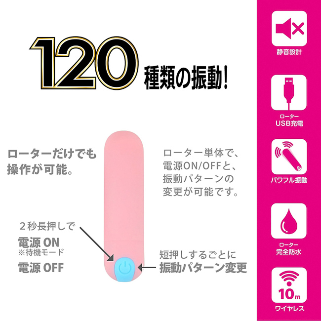 遠隔プレイの歴史を塗り替える、マニアが考案した本当に「外」で使えるリモコンローター!10m超先のローターを完全支配!手元のLED×12個搭載した親機で、完全コントロール!現在の振動パターンが解りやすい伝統の12LEDを採用。イザ!となったら一時停止モードも完備。(5分で自動OFF)。12段階のパワー×10種類の振動パターン=120種類の快感で、必ずピッタリの絶頂ポイントが見つかります。