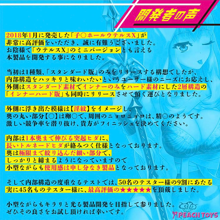 刻み込まれた淫紋はウテルスを駆け昇る!●内部は、奥まで伸びる1本の突起ヒダに、ネジれるトルネードヒダが長く絡みつく「ヒダとクルクル構造」!●奥は極限まで絞り込んだ細い部分で、しっかりと締まり、小型ながらも使用感は大満足間違いなし!●丁度良い肉厚感!●グミのような柔らかさのスタンダードタイプ。本体サイズ:全長14.2cm重量:200gパッケージサイズ:15.0×10.5×6.0cm