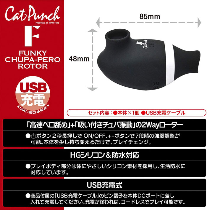 2種類の異なった刺激を楽しめるローターがコンパクトなボディに合体したツイン振動!「高速ベロ舐め」ローターは掘り起こすように高速ベロベロ攻撃!敏感な突起を舌先で転がすように「シリコンのベロ」が上下に高速振動。「吸い付きチュパ振動」ローターは吸い付くクチビルがブルブル振動攻撃!敏感な突起に吸い付きながら振動!かわいい「タコくち」が、ついばむように高速刺激。体に優しいシリコン素材を採用し、生活防水に対応しています。全長:8.5cm吸引口内径:1.5cm電池:USB充電