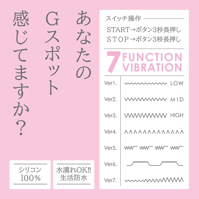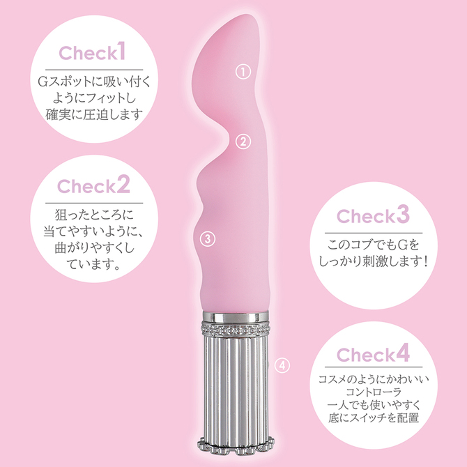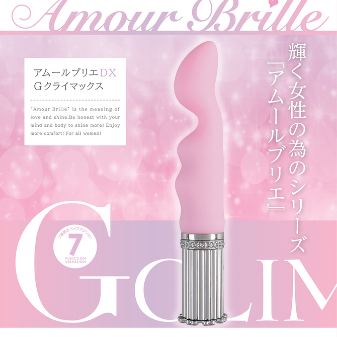 AMOUR BRILLE(アムールブリエ)は愛と輝きの造語です。愛が輝くバイブシリーズという意味でネーミングされています。こちらの「アムールブリエDX G CLIMAX」は、先端にローターを配置し、首の部分が自由に曲がります。先端部分が曲がり、ローターが内蔵されていることからまるでバイブが意思をもって動いているかのような使い方が可能です。そして胴体につけられた2つのコブが敏感な部分を擦り上げるように刺激します。かわいい細身のタイプのバイブですが、その威力は想像を超えるものです。安心して使用できるシリコン100%。振動は7段階のファンクションを搭載しています。