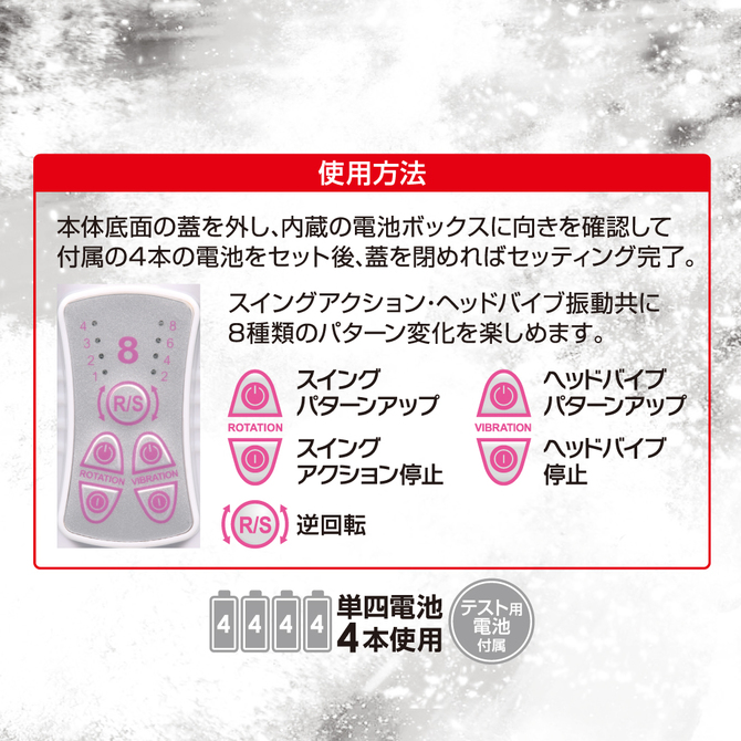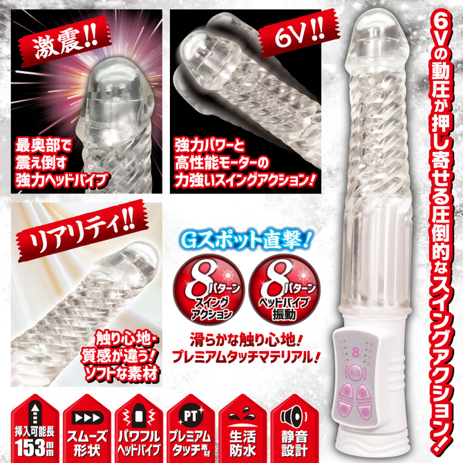 中イキに特化したストレートタイプになったガイアバイブ。8パターンのスイングと振動を個別に操作出来、刺激に変化を与えるリバース機能も搭載。有効挿入部15.3cmのストレート形状がスイングしながら最奥のスポットで強力振動を発揮。ナカ派にはたまらない徹底快感を味わえます。衛生的でリアルな柔らかさを追求した特殊ラバー素材「プレミアムタッチ」を採用したオススメの一本です。本体サイズ:21.7×Φ3.4cm電池:単4×4本パッケージサイズ:23.2×7.5×4.0cm
