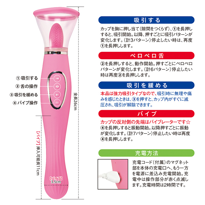 バストマッサージ&クリ吸引&バイブ。究極のマルチ快感マシーンが爆誕。バスト、ヴァギナ用の2種類カップを交換してどちらにも吸引が可能です。カップ無しでの舐めバイブ、カップありの吸引バイブをお楽しみいただけます。手持ち部分はバイブ機能つき。挿入も可能なミドルサイズバイブとして使用可能。深田えいみちゃんも大満足なオールマイティーバイブ。本体サイズ:26.0×Φ3.5cm電池:USB充電式重量:225gパッケージサイズ:29.5×15.0×6.5cm