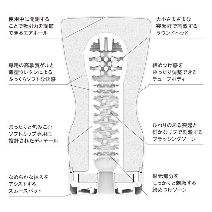 「テンガ スクイズチューブ・カップ ソフト」 まったりと絡みつく超ソフト設計。自由に握って、締めつけコントロール。やわらかでしなやかなチューブ容器を採用したことで、握力がダイレクトに伝わり、締めつけ感を絶妙に調整することができます。フレキシブルボディをやさしく揉むことで、まったりと絡みつく超ソフトな刺激を、じっくりと長く楽しめます。