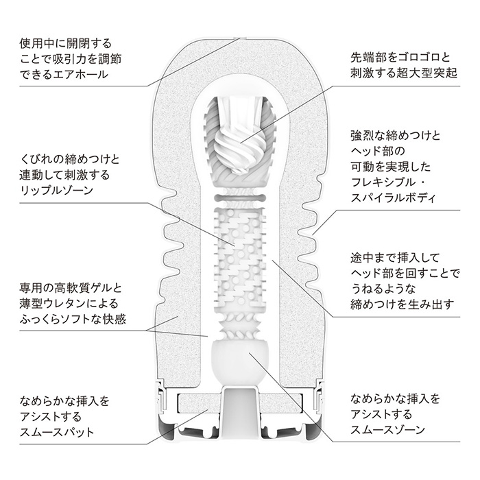 「テンガ ローリングヘッド・カップ ソフト」 強力な締めつけと、自由自在な先端刺激。くびれのあるスパイラルボディによって、フレキシブルに操作しながら、連続する強烈な締めつけを感じることができます。しっかりとした締めつけを感じながら、超ソフト設計による、まったりと撫でるような先端刺激を楽しめます。