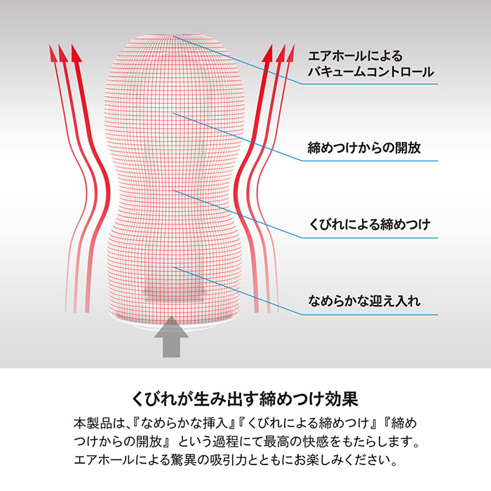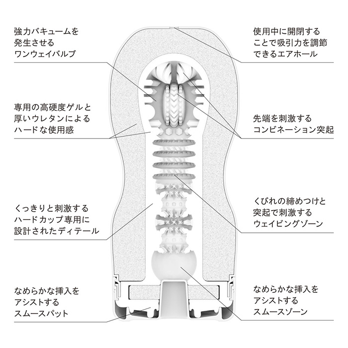 「テンガ オリジナルバキューム・カップ ハード」 くっきりと刺激する超ハード設計。くびれ効果で、DEEPな吸いつき感。特殊なバルブ構造によって、エアホールをふさぎながら引き抜くと、内部が真空状態に近づき、驚異のバキューム効果が発生します。くっきりと刺激する超ハード設計によって、強力に締めつけながら、強力に吸引される快感をお楽しみください。