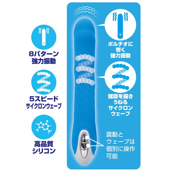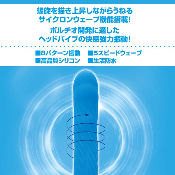 螺旋を描き上昇しながらうねるサイクロンウェーブ機能搭載!更にヘッドに内蔵された強力モーターの震動がポルチオに響き渡る!スイングとはまったく異なる動きでGスポットをグリグリと刺激!震動とウェーブは個別に操作可能。●8パターン振動●5スピードサイクロンウェーブ●医療品質シリコン●生活防水●静音設計本体サイズ:24.0×Φ3.7cm電池:USB充電式パッケージサイズ:24.0×11.0×7.5cm