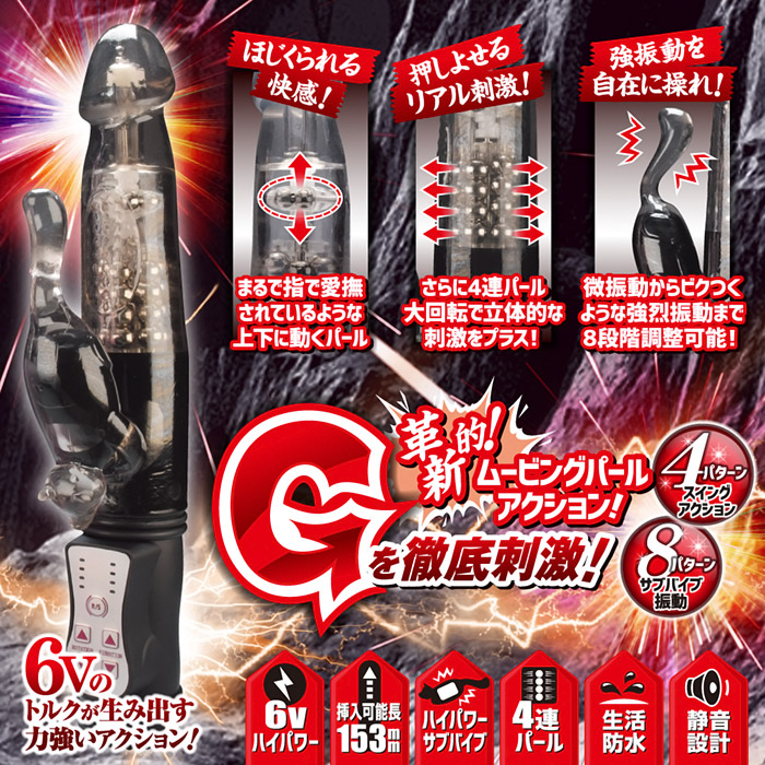 ほじくるようなムービングパール機能搭載。局部を徹底的に刺激する革新的アクション。6Vのハイパワースイングと4連パール大回転+微細振動のクリバイブ。リバース機能付きで色んなバリエーションで快感を楽しめるミドルサイズバイブ。上下に動くムービングパールが今までにない刺激感覚を実現。