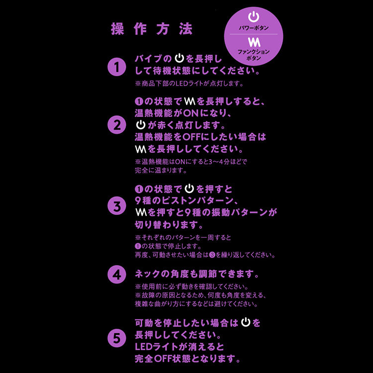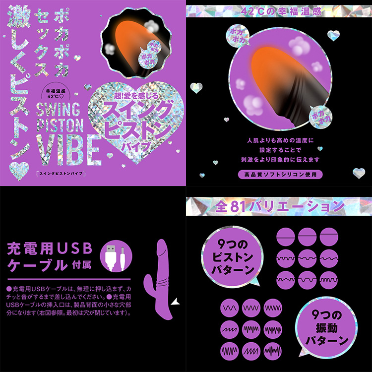 愛を感じるあったかスイングピストンバイブ!9パターンピストン×9パターン振動の全81バリエーション!激しくピストン、ポカポカセックス。温熱機能は人肌より高めの42度に設定にすることにより、興奮したアソコの熱感を再現しました。じんわりあったかな温もりを中で感じちゃってください。9種のピストンパターンに加え、ネック部分を好みの角度で曲げると、360度かき回すスイングピストンに!スイングしながらピストンすることで中を余すことなく刺激できます。外を刺激するパワフルローターも搭載!敏感な部分に直接触れるものだから、ぷにっとソフトな素材を使用しました。防水、静音設計。