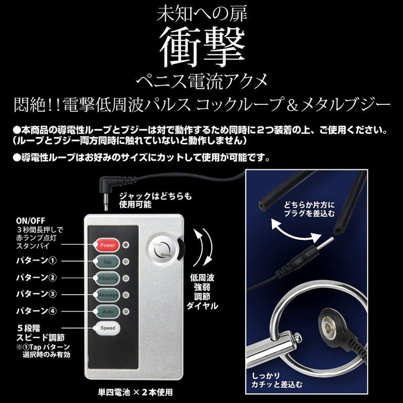 悶絶!電撃低周波パルスで感じるコックループ&ステンレスメタルブジー!!低周波の刺激でビクンビクンと脈打つ刺激的な逸品。より強い、クセになる刺激を求める方に長く愛されてきた低周波シリーズ。ループ本体はお好みのサイズにカットして使用が可能です。・4パターンパルスパターン・5段階パルススピード本体サイズ:フリーサイズ、ブジー10.5×0.35-0.75Φcmセット内容:コントローラー、コックループ、メタルブジー、接続ケーブル※コックループとブジーは対で動作するため必ず2つ同時に装着の上お楽しみ下さい。パッケージサイズ:13.5×7×5.5cm