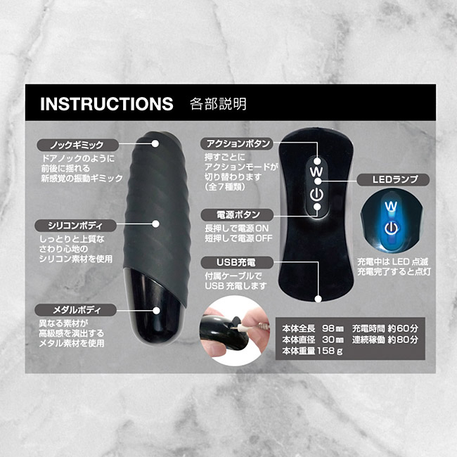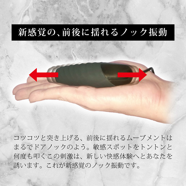 新感覚ムーブメント、前後に揺れるノッキング振動。コツコツとドアをノックするような新しいアクションが楽しめるローターです。敏感スポットをドンドンドンと何度も叩くこのアクションは、アナタを快感の虜にします。ノックムーブメントは趣向を凝らした7種類のアクションモードを搭載。じっくりから激しくまで、多彩な動きを披露します。本体部分は異なる素材を使用。すべすべしっとりの触り心地となるシリコンボディに、高級感溢れるシックはメタルボディとなる贅沢な仕上がり。ハイパワーを実現させるリチウムバッテリーに、使いやすいUSB規格です。ハイクラスとラグジュアリーが両立するノッキングローターです。