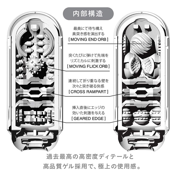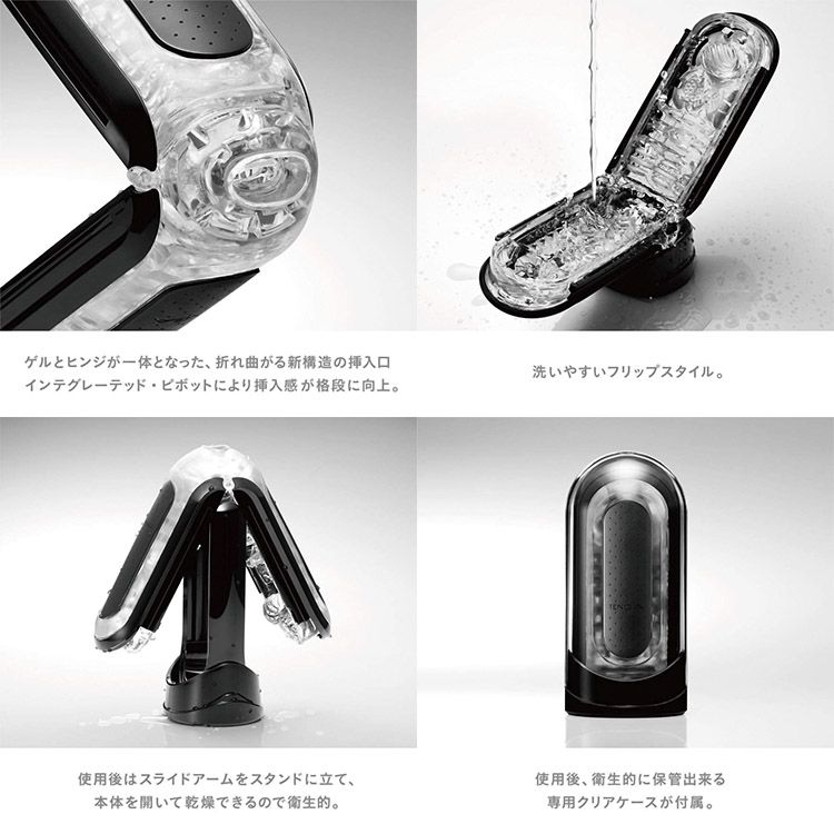 あのFLIP 0(ZERO) に、ファン待望のBLACKが登場。未来型FLIP HOLEの生み出す究極の快感。未体験の、ハードな刺激!新たに設計された高密度ディテールが生み出す、エッジの効いたハードな刺激。新配合の高弾力ゲルによるハジける快感とストロングバキューム。非分割のシームレスな挿入口により、ローション漏れを防ぎ気密性も向上。洗いやすいフリップスタイルに加え、衛生的に保管出来る専用ケースが付属。高弾力ゲルと高密度ディテールによって、ハードな締めつけとストロングバキュームを実現。これまでにない、ハジける快感をお楽しみください。