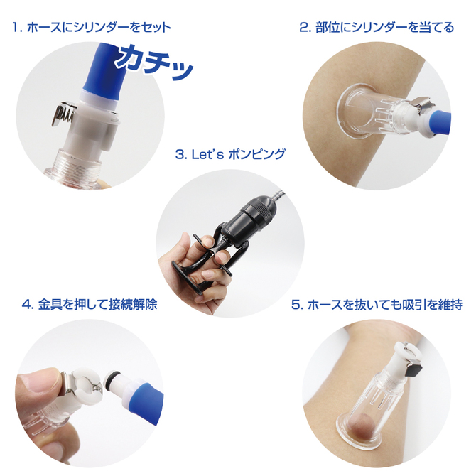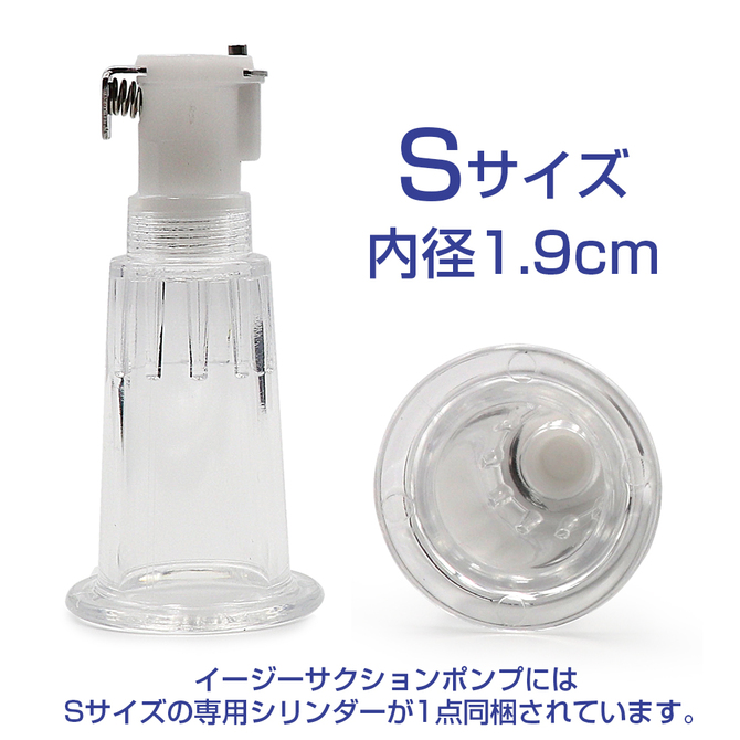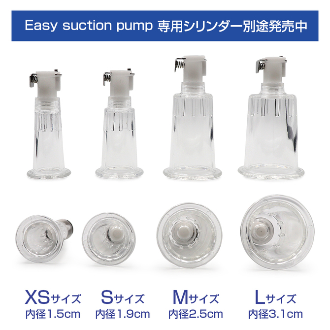 気軽に使えるピンポイントバキュームポンプ! 意図した箇所にシリンダーを当てポンピングするだけで、あっという間にかつてない吸引を体感できます。シリンダーの金具を押しながら抜くだけで本体と解除ができます。 専用シリンダーは逆止弁を装備。吸引後に本体との接続を解除しても吸引を維持した状態で保ちます。ホース長は26cm。一人プレイでもカップルでも扱いやすい長さです。 イージーサクションポンプにはSサイズの専用シリンダーが1点同梱されています。 シリンダーSサイズの内径は1.9cmなので、乳首や敏感な部分の吸引に最適です。