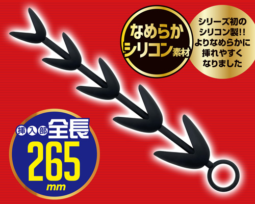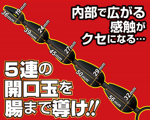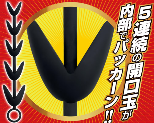 内部の圧迫感を楽しめる「アナパッカーン」にシリコン製ビーズタイプが登場。大きく二股に開いた玉が5つ連なっているので、入口から奥までくまなく圧迫。括約筋で内部に力を入れたり緩めたりする事で口がパクパクと動き、心地よい快感を堪能する事が出来ます。全ての玉を入れた後に一気に引っこ抜くと、タマが連続してパッカーンと開く!内部で広がる感触がクセになる!5連の開口玉を腸まで導け!本体サイズ:挿入部全長26.5cm、直径1.9〜3.2cm(蕾の状態)パッケージサイズ:36.3×11.6×3.2cm