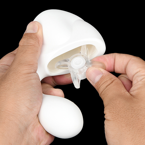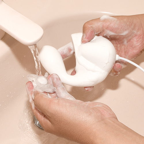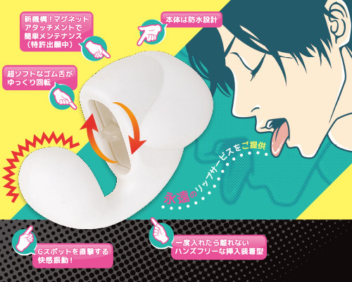 タテ回転によるゴム舌の摩擦刺激と、圧迫&振動するヘッドにより、内外を同時に愛撫できる特殊機構バイブです。大きく丸いヘッドは、ひとたび挿入すると簡単には抜けない設計のため、ベストポジションを決めた後は完全なハンズフリーで楽しめます。付属する舌型アタッチメントは、「2枚ロング」と「4枚ショート」の2種類。ロングは摩擦するストロークが長いため、マイルドでねちっこい特性。反対にショートは、ペチペチと小刻みに連続で舐めつづけるハード寄りの特性です。アタッチメントの交換はマグネット式でとても簡単。スピード7段階×動作パターン5種と組み合わせれば、じつに70種類ものワイドレンジな快感バリエーションが存在します。なかでも「2枚ロング舌」と低速&振動なしモードの組み合わせは、既存の電動モデルではなかなか実現できなかった超ソフト刺激なのがポイントで、ジックリ&ゆっくり性感を高めたいロングプレイ派にマッチ。ハンズフリーの特性を活かせば、ソファやクッションに寝転んで、テレビやスマホを見ながらの「ながらプレイ」も快適に楽しめます。スティック状のバイブとは異なり、コントローラー別体式だからプレイ中の操作性に優れ、アタッチメントと本体(コントローラー除く)が防水仕様のため、メンテナンス性も良好。快感性能とユーティリティ、どちらもシッカリ仕上げたオススメのアイテムです。