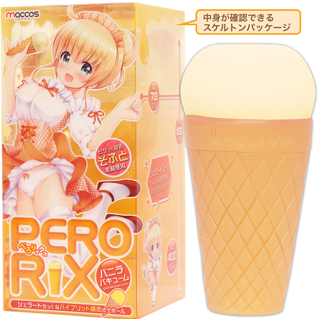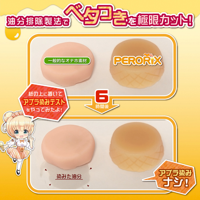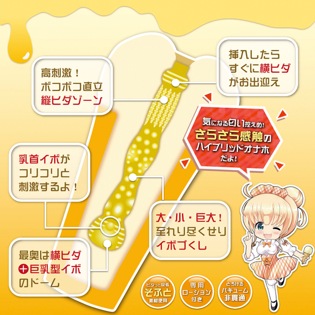 「ペロリックス バニラバキューム」は「ソフト素材」を使用した「やわらかタイプ゚」の2層構造オナホールです。外側は硬い素材で内部はやわらかい素材がピタッと吸着し、濃厚にまとわりつくバキューム力をお楽しみいただけます。黄色い外観で「バニラアイス」そっくりな見た目の内部は「横ヒダ→縦ヒダ→イボ群集→巨乳型イボ」の連続するギミックを搭載。かわいい見た目に反し、多様な刺激が連鎖するハイブリッド構造の高刺激オナホールとなっています。扱いやすいミドルサイズ。ジェラートコーンを模した形状は手に馴染み、ハンドホールとして理にかなった持ちやすいフォルムです。素材は「油分排除製法」を採用し「ベタつき」や「気になる臭い」を極限カット。PERORIXはキュートな見た目でありながら、利便性と快感を兼ね備えた本格派のオナホールです。イラスト:葵カナン
