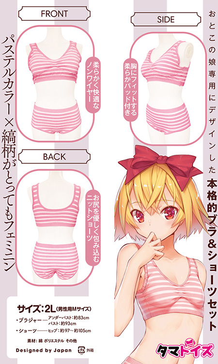 おとこの娘専用にデザインされた本格的ブラ&ショーツセット。パステルカラー×縞柄がとってもフェミニンでニット生地のソフトな肌触りが、着心地の良さをアシスト。柔らかく快適なノンワイヤーで胸にフィットする柔らかパット付き。お尻を優しく包み込むニットショーツ。伸縮性抜群!サイズ: 2L(男性用Mサイズ)ブラジャー アンダーバスト:83cm バスト:93cmショーツ ヒップ:約97〜約105cm 素材:綿 ポリエステル その他