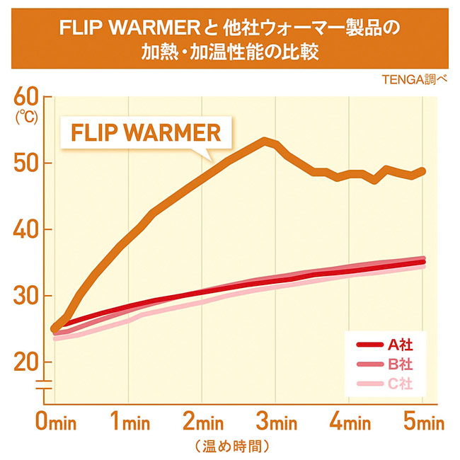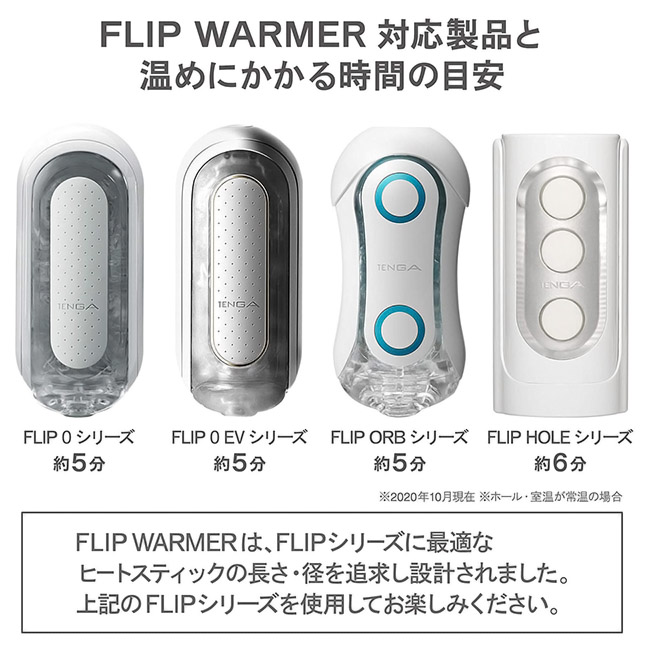 フリップホールシリーズ、フリップゼロシリーズ、フリップゼロEV、フリップORBシリーズに対応した「TENGA FLIP WARMER」。約5〜6分でホール内の温度を40度〜45度程度に温めてくれるアイテムです。温めたあと、使用前に指などで適温になっていることを確認してから挿入してください。アルミの熱伝導を利用したハイパワーな加熱システムの実現により、挿入口から奥までしっかり温まります。スマートタッチ操作でHIGH・LOWの2段階に温度調節が可能。自分好みの温かさに包まれる快感を、フリップシリーズにてお楽しみください。