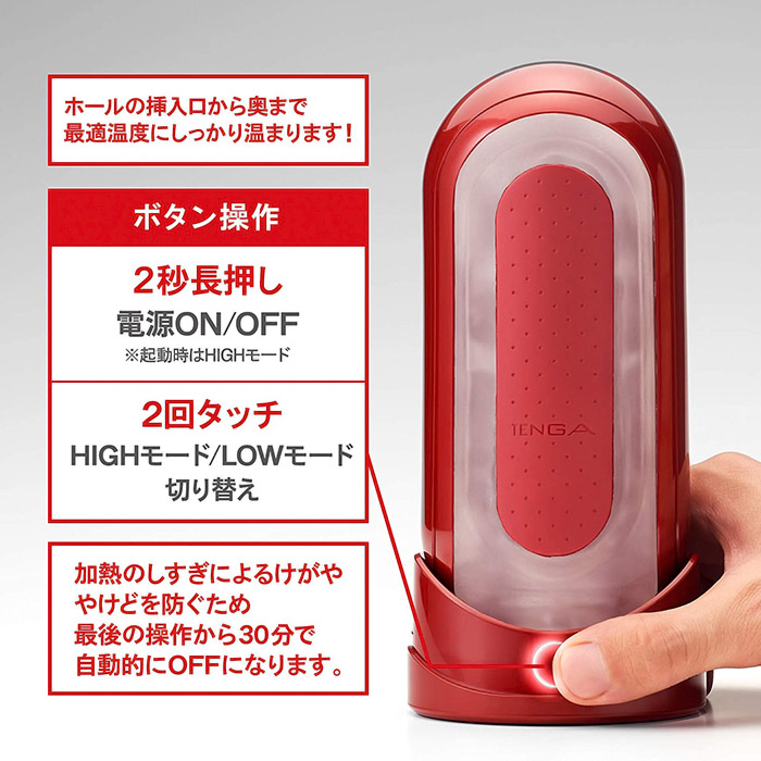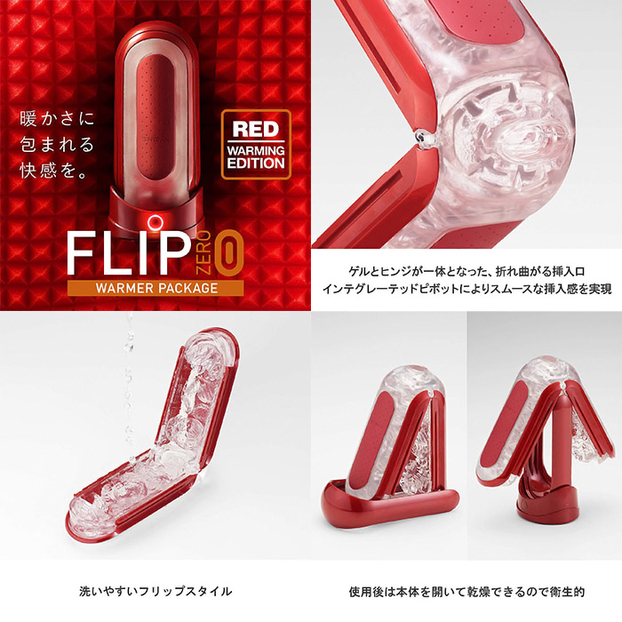FLIP WARMERの加温機能に対して、最適に設計されたディテールと、温かい快感にマッチするソフトゲルを採用しました。折り重なるように配置された高密度ディテールが、人肌のような熱を帯びることで、ぬくもりとともにまったりと絡みつきます。FLIP WARMERは、FLIPシリーズのために専用設計された加温デバイスです。アルミの熱伝導を利用したハイパワーな加熱システムの実現により、挿入口から奥までしっかりと温めることができます。自分好みに調節できる加温機能と、FLIP史上最高の柔らかさが実現した、ぬくもりに包まれる快感をお楽しみください。 TENGA FLIP 0(ZERO) REDとWARMERのセット商品です。