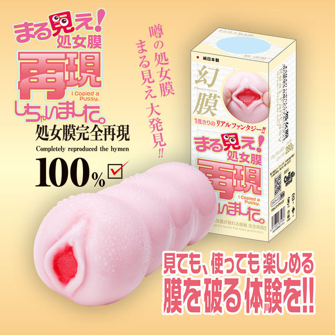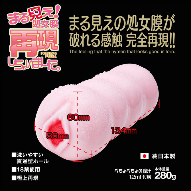 1度きりのリアルファンタジー!まる見えの処女膜が破れる感触を完全再現!処女の締め付けを再現し洗いやすい貫通型ホールです。入り口付近を開きすぎると処女膜が破れる可能性があります。初めての時は開きすぎ、指入れにご注意ください。見ても使っても楽しめる膜を破る体験を!本体サイズ:全長13.4cm 最大幅5.6cm本体重量:280g日本製