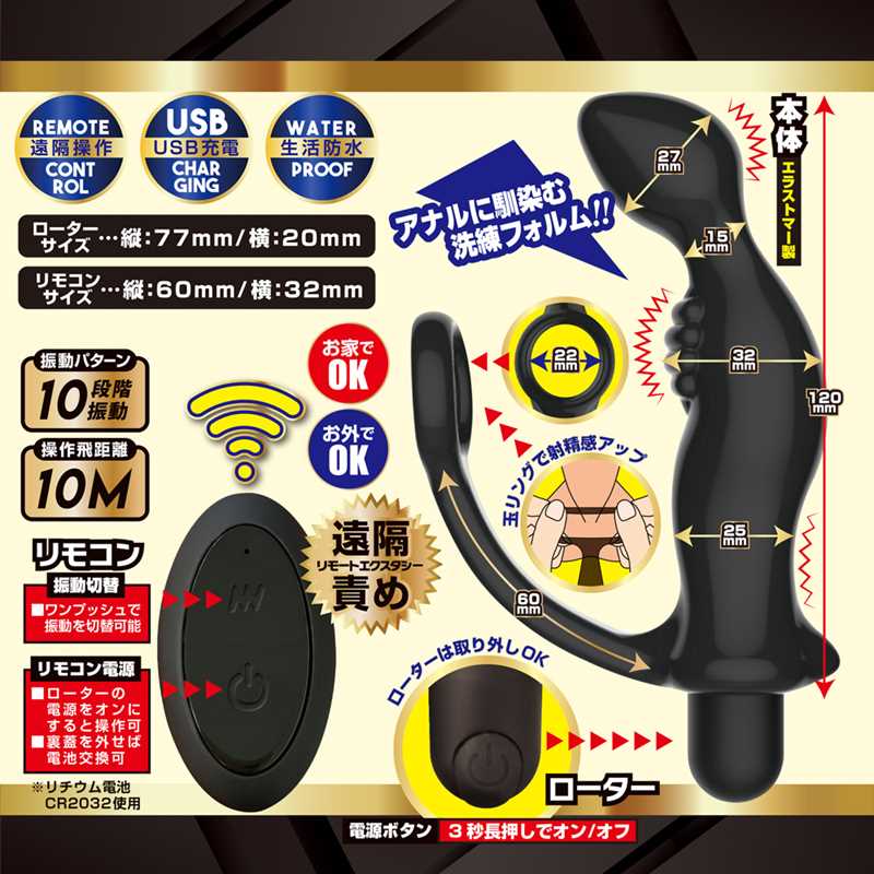 リモコン操作で快適アナニー!前立腺責めでリモートオーガズム!遠隔操作可能なアナクローザーが登場!操作飛距離は約10Mとなっており振動数は10段階です。簡単操作で、ながらプレイや野外プレイも超らくらく。フィット感抜群のボディが、感度良好な刺激を誘発!!雄穴悶絶エクスタシー!前立腺震撼リモートプレイで、究極のオーガズムを手に入れよう。生活防水なのでお手入れもラクチン♪セット内容:本体、ローター、リモコン、充電ケーブル、コイン電池