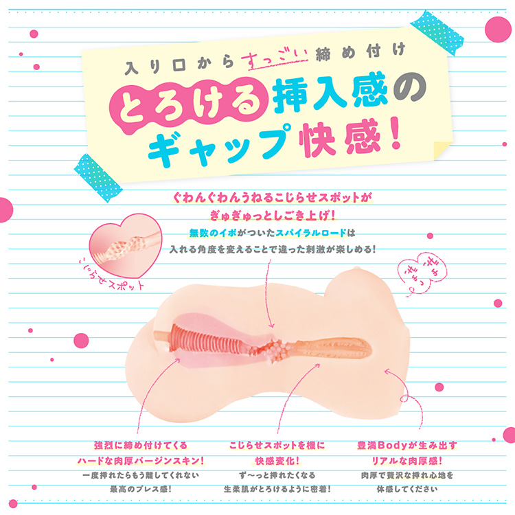 ハードtoソフト!快感変化のギャップ構造!ぐわんぐわんうねるこじらせスポット搭載!ずっしり肉厚540gの豊満Bodyはとっても贅沢な挿れ心地!強烈に締め付けるハードなバージンスキンの入口から、ずーっと挿れたくなるようなとろとろソフト素材への快感の変化を楽しめます!真ん中に配置されたこじらせスポットは、ピストンのたびにぎゅぎゅっとしごき上げ!締め付け・こじらせ・生柔肌の3つの快感!贅沢な挿れ心地を体感してください。本体サイズ:16.0×Φ9.3cm重量:540gパッケージサイズ:17.5×12.0×8.0cm