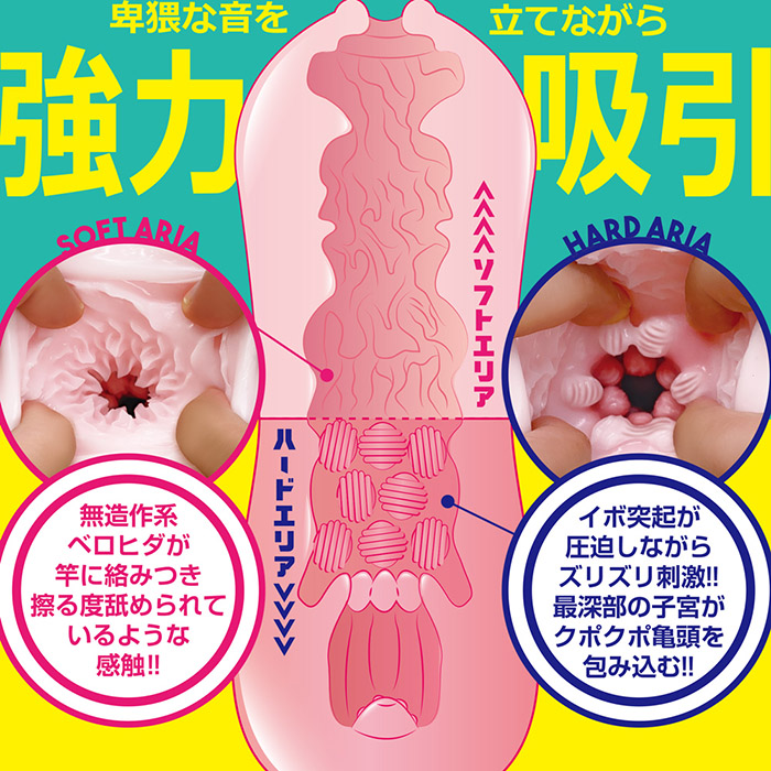 本体の前半と後半で硬度が異なる2層構造が特徴の「ツインフィール」を採用。硬度の違いが刺激に変化を作り、1度のストロークで多彩な表情を見せます。素材は、研究を重ね誕生した新素材「ピュアセンス」を採用。肉感的で弾力のあるもっちり人肌感覚。ニオイ・ベタつきが気にならないので、プレイに集中できます。卑猥な音を立てながら強力吸引。初心者でも安心して使用可能!1ストロークで多彩な表情を魅せながら激しいバキューム感を楽しめる! <ソフトエリア> 無造作系のベロヒダが竿に絡みつき、擦る度舐められているような感触 <ハードエリア> イボ突起が圧迫しながらズリズリ刺激!!最深部の子宮がクポクポ亀頭を包み込む