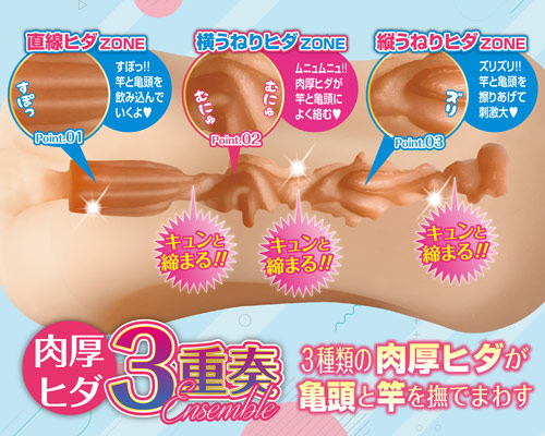性欲って、時に美しく、時に儚い・・・。性欲が織りなす、いろんな感情をコンセプトとした商品です。10代のリコちゃんをイメージした、竿が思わずキュンとするのはヒダのみのオナホール。 【内部形状】 ■直線ヒダゾーン・・・竿と亀頭をすぽっ!!と飲み込みやすい直線ヒダ形状 ■横うねりヒダゾーン・・・ムニュムニュとした肉厚ヒダがよく絡む ■縦うねりゾーン・・・ズリズリッ!!と射精をさらに促す最後のヒダ刺激