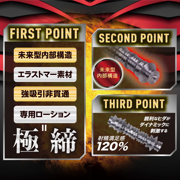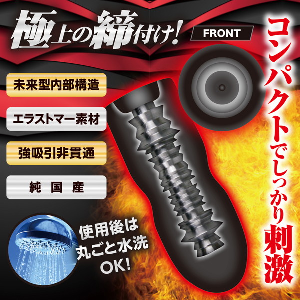 射精満足感120%!小型ホールのポテンシャルを超越した未来型内部構造を搭載。強吸引の刺激がマッハで射精を促す。鋭利なヒダの凸凹が生み出すダイナミックな刺激と極上の締め付けで亀頭に喰らい付き搾り取る。エラストマー素材で耐久性が高く、丁寧に扱うことで繰り返し使用することも可能。重量:57gパッケージサイズ:10.0×5.0×5.0cm