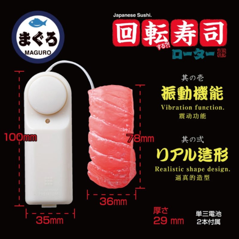 まさに回転寿司ローターなローターの登場!老若男女全世界で人気の寿司ネタが、ブルブル震えるオモチャになって登場です。最高級品は一貫5000円以上?! 寿司ネタの王様・まぐろ!そんなマグロをリアルに再現したのがこちらの商品です。振動機能が付いているので、用途に合わせてブルブルさせちゃってください。日本を代表する食文化・寿司、海外の方へのお土産にも人気の一品です。寿司部分:全長10.3×最大幅3.5cm単三電池 ×2本付属パッケージサイズ:H17.0×W9.3×D4.5cm