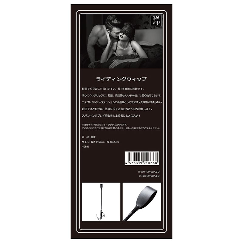 軽量で初心者にも扱いやすい、長さ53cmの短鞭です。滑りにくいグリップに、軽量、高品質なPUレザー使いで長く使用できます。コスプレやレザーファッションの小道具としてもオススメ。先端部分は柔らかい合皮で痛みを軽減、強めに叩くと音も大きくなり興奮します。スパンキングプレイ初心者も上級者にもオススメ!パッケージ:54×12×2.8cm本体:全長5.3cm 幅3.5cm