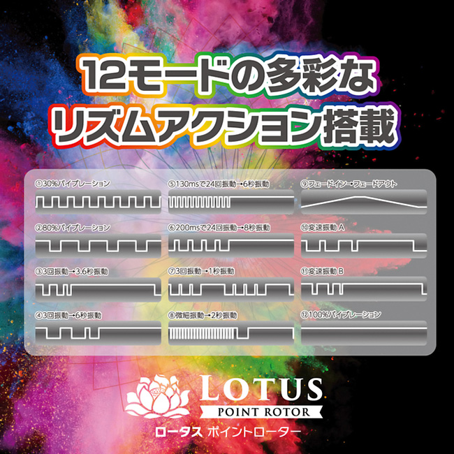 女性の意見を取り入れ、重視して開発されたシンプルポイントローター!外観は可愛らしい蓮の蕾をデザインに取り入れ、激振動なのにしびれにくく、そして静音設計なので深夜の使用も安心!生活防水なので使用後のお手入れも簡単です。ボタン1つで12モードの切れ替えができる簡単操作も魅力!USB式充電採用で電池不要で繰り返し使えて経済的です。本体サイズ:縦11.5×横3.4×奥行3.4cm本体重量:66gUSB式充電用コード