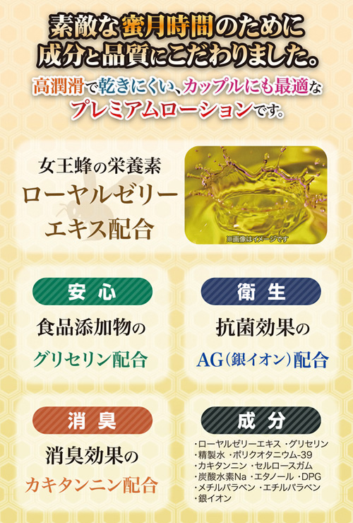 BEEローションさらさらプレミアム300mlは【ローヤルゼリーエキス】を配合したプレミアムなローションです。体に触れるものだから成分と品質にこだわりました。他の成分は敏感部分に優しい食品添加物の「グリセリン」抗菌効果がある「AG(銀イオン)」消臭効果がある「カキタンニン」を配合しています。ローションの粘度は高潤滑で乾きにくく、オナホール使用はもちろんのこと、長時間楽しむカップルでのご使用にも最適です。※商品は食品ではありません。使用する人によってアレルギー症状を起こす事があります。その際は使用を中止して医師に相談してください。ご使用後は中身の乾燥を防ぐ為にしっかりと閉めて保管して下さい。直射日光を避け、涼しいところで保管してください。開封後はなるべくお早めにご使用ください。