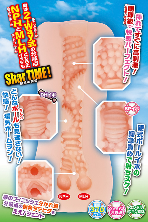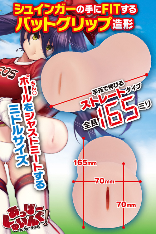二刀流イボを全力で射ちヌケ!あっぱーしゅいんぐ!(Upper手淫具)は、ロングセラー商品「ふるしゅいんぐ!(FULL手淫具)」の続編となる、全長165ミリ・重量370グラムのミドルオナホールです。中間部に配置された2つの巨大ヒダイボ(二刀流イボ)が最大の特徴で、狭道内に交互で連なり上下から圧迫を行う高刺激構造となっています。その二刀流イボとの快感アクセントとして「中イボ・横ヒダ」を内部に全面配置。最奥の「2つのフィニッシュポイント」を隔てる「鋭角タテヒダ」のエッジも加わり、全体を通して緩急のある多様な刺激をお楽しみいただけるオナホールとなっています。