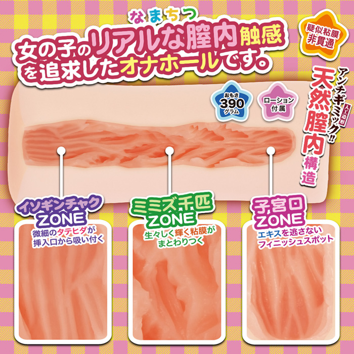 アンチギミック!天然●内構造!なまち●Glitterは「女の子のリアルな●内触感」を追求したオナホールです。イボやヒダなど、オナホ特有の人工造形は敢えて行わず「●内の粘膜触感に近づける」をコンセプトとして商品化しました。挿入口から最奥まで連なる疑似粘膜の「天然●内構造」は「イソギンチャクZONE」「ミミズ千匹ZONE」「子〇口ZONE」と3つのZONEに分かれ、それぞれに「個性ある●内触感」をお楽しみいただけるようになっています。ボディはロングプレイに最適な全長160ミリのハンドフィットサイズ。嫌なゴム臭を徹底カットし、女の子の肌質感触をイメージした「やわはだ素材」の採用により、「人工物によるプレイ」を極力感じずにお楽しみいただけるリアル系オナホールになっております。なまち●Glitterで「本物の女の子触感」をお楽しみください。