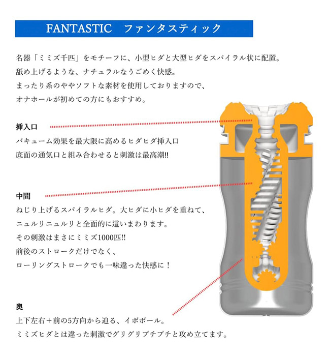 挿入口はバキューム効果を最大限に高めるヒダヒダ挿入口。 中間はねじり上げるスパイラルヒダ。大ヒダと小ヒダを重ねて、ニュルリニュルリと全面的に這いまわります。 奥は上下左右+前の5方向から迫るイボボール。