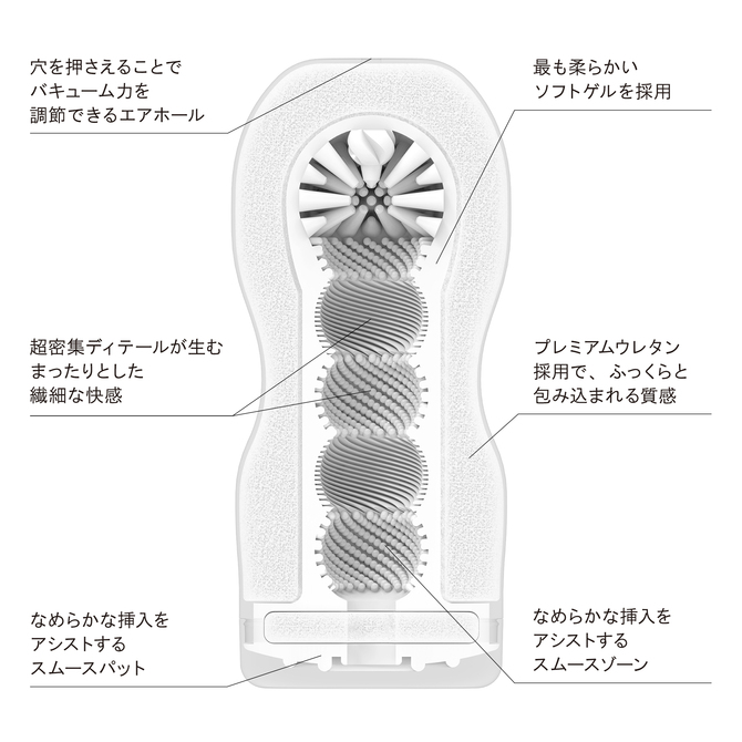 TENGA史上、最ソフトゲル仕様!TENGA ORIGINAL VACUUM CUPに、超繊細ディテールで、まったり包みこむ【EXTRA SOFT】が登場。極小突起となめらかなリブで構成された、超密集ディテールによって、まったりと包みこむような、繊細でやさしい刺激を実現しました。さらに、最も柔らかいソフトゲルも採用した特別仕様のカップです。TENGA CUPシリーズ史上、最もソフトな究極の快感をお楽しみください。サイズ:6.9×6.9×15.5cm重量:140g