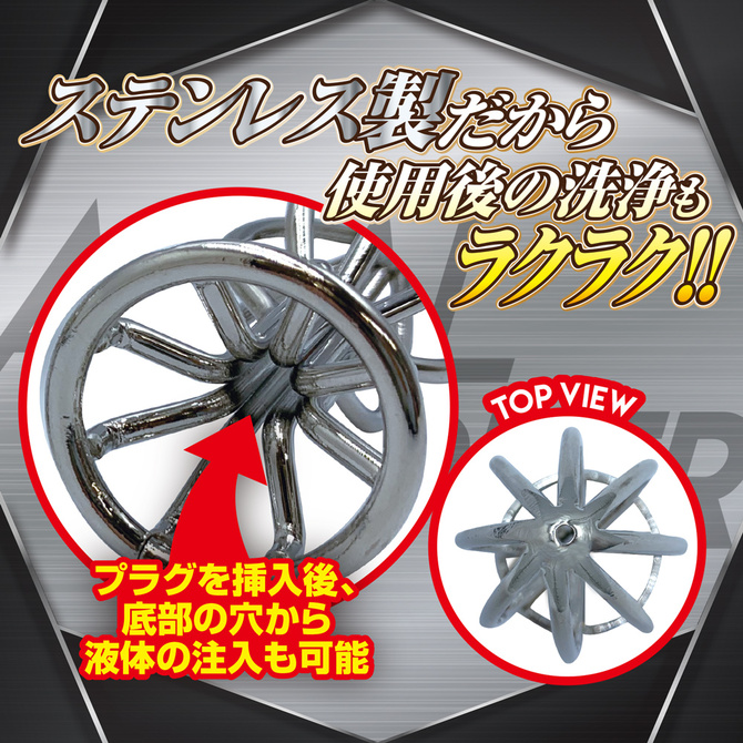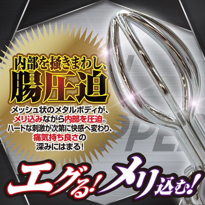 エグる!メリ込む!内部を掻きまわし、腸圧迫!!!!メッシュ状のメタルボディがメリ込みながら内部を圧迫。ハードな刺激が次第に快感へ変わり、痛気持ち良さの深みにハマる!プラグを挿入後、底部の穴から液体の注入も可能!ステンレス製なので、温熱・冷却しての使用、煮沸消毒もOK♪使用後の洗浄もラクチン。磨き上げられたメタルボディでハードにエグれ!!!Sサイズは初心者でも安心!パッケージサイズ:H20.2×W12.0×D2.9cm本体サイズ:全長6.7/挿入部4.0/最大径2.9cm重量:本体29g材質:ステンレス
