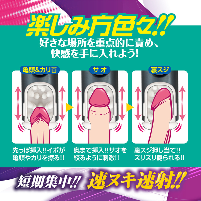 マッハ級のピストンで高速刺激! ハンドホールでは体験不可能な高速ピストンで、一気に絶頂まであなたを導く。 弾力感抜群の専用ホールは、内部に無数のデカイボを配置し、全体に衝突するように刺激。 シンプルで使いやすい操作性だから、一心不乱にプレイできる。 ホールは簡単に取り出せるので、メンテナンスもらくらく。 短期戦を制し速ヌキ速射!!爆シコでキメろ!!