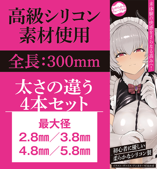 シリコンカテーテル4本セット 未体験の快感をさらなる高みへ! 高級シリコン素材使用 初心者に優しい柔らかなシリコン製 高級シリコン素材が生み出すソフトな質感 なめらかなウェーブ形状 太さの違う4本セットパッケージサイズ:H19.0×W11.8×D3.2cm本体サイズ::全長30.0×最大径0.28cm/全長30.0×最大径0.38cm/全長30.0×最大径0.48cm/全長30.0×最大径0.58cm重量:20gイラスト:ヴァイス・アンネリーゼ/はかば