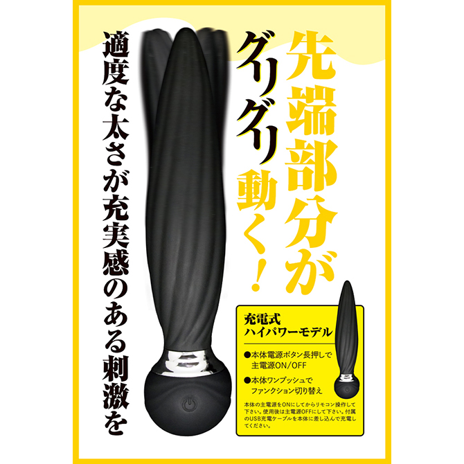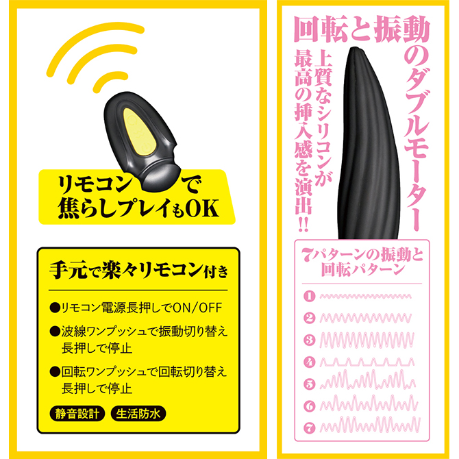 充電式ハイパワーモデル リモコン付き。強力バイブレーションと回転で強烈オルガ発動! 7パターンの振動と回転パターン。上質なシリコンが最高の挿入感を演出し、適度な太さが充実感のある刺激を与えてくれる。リモコンで焦らしプレイもOK!グリグリと敏感部分を刺激する。 静音設計 生活防水