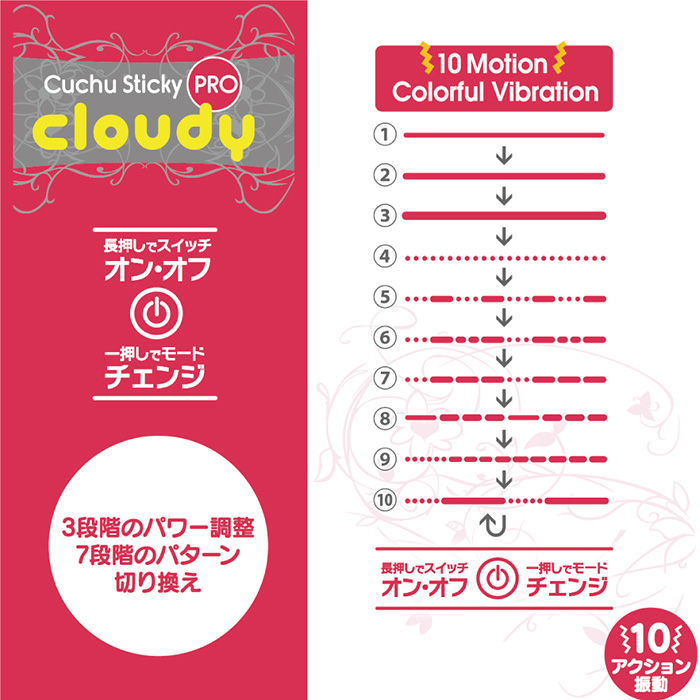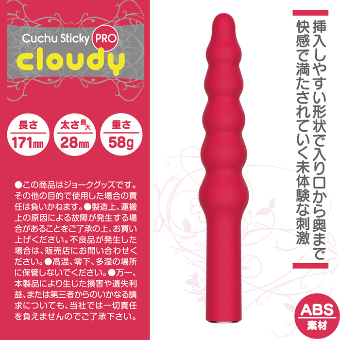 ポコポコとした雲のような形状で入り口から奥までの刺激を楽しめます。10モードも振動パターンがあるので必ずお好みの刺激が見つかるはず。生活防水設計になっているのでメンテナンスも簡単。マグネット式の充電用USBケーブルが付属しておりますのでご家庭の環境で充電可能。操作方法も電源スイッチの長押しでオン・オフ出来る為、簡単です。クリムゾンマットコーティングのボディは長さ17.1cmと十分なサイズ、太さは最大2.8cmで細い部分から徐々に太くなるのでどなたにでも使用して頂けます。