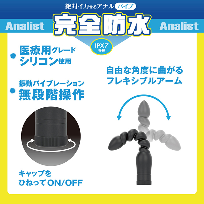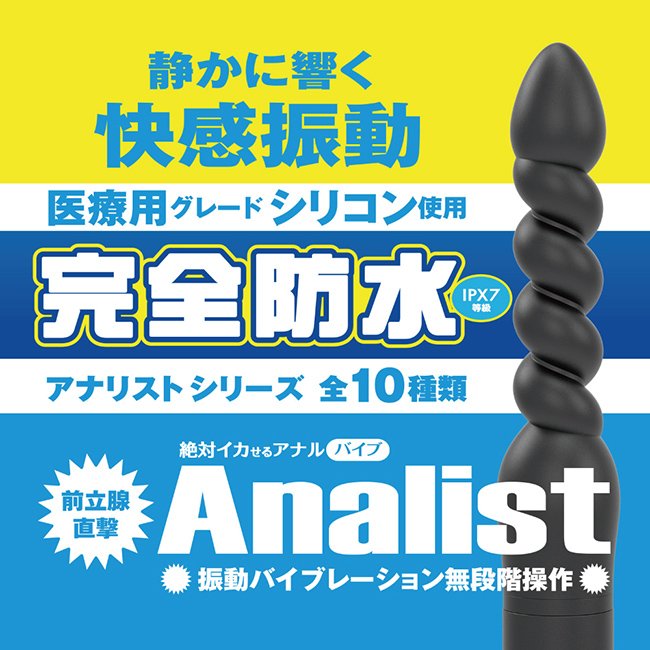 ツイスト状のアームが、括約筋にねじ込まれる! 初心者〜上級者まで愛用の人気アナルバイブが、待望の完全防水化!(IPX7) 010は、ツイスト状のアームが括約筋にねじ込まれてイク! 突き抜ける先端は、前立腺から奥まで刺激。先っちょでポイント刺激も。自在に曲げて、好みのポイントを刺激できるフレキシブルアームを搭載。パッケージサイズ:24.5×8.5×3.8cm本体サイズ:18×3.1cm 挿入径:2〜3cm