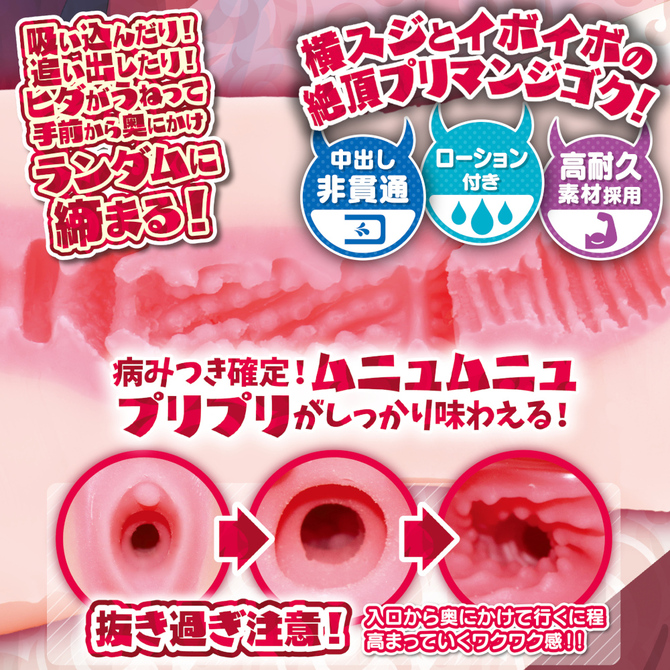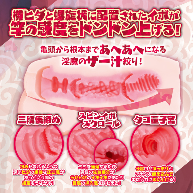 初心者から上級者まで使いやすい定番のサイズ!横ヒダと螺旋状に配置されたイボが竿の感度をドンドンアップします!亀頭から根本まで「あへあへ」になる、まさに淫魔のザー汁絞り状態!!三段俵責めからスピンイボスクロール、タコ壺子宮と複雑なギミックが、あなたを迎えます。パッケージサイズ:21.5×16.0×10.0cm本体サイズ:17.8×11.0×11.0cmタイプ:非貫通付属品:ローション