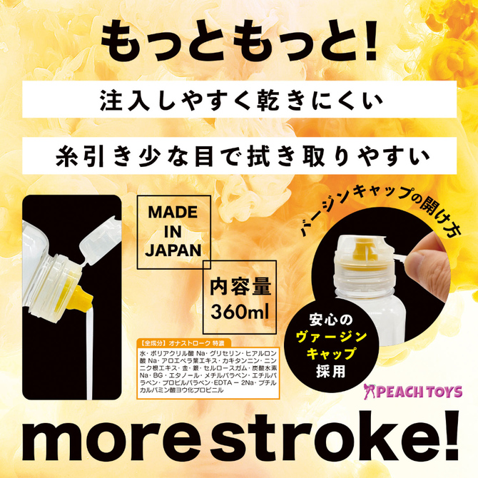 『オナホにはコレでしょっ!!』『もっともっと!more stroke!』高潤滑オナホ専用ローション!「オナストローク」「オナストローク特濃」の2タイプが登場です!!・糸引き少な目で拭き取りやすい・安心のヴァージンキャップ採用(横向きに引きちぎってからキャップを開けてください。)・注入しやすく乾きにくい・ヒアルロン酸、アロエエキス、カキタンニンエキス、ニンニクエキス配合、無香料パッケージサイズ:高さ:18.0cm/底面直径:5.9cm内容量:360ml
