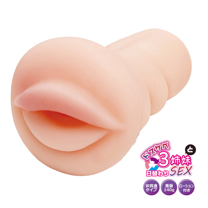 【小型非貫通タイプオナホール】 小型非貫通タイプのオナホールです。 もっちりと伸びる高弾力素材で、自身の握る力で刺激を調整可能! ドスケベ3姉妹の長女・次女・三女全員が異なった特徴のホールをぜひ堪能してください!