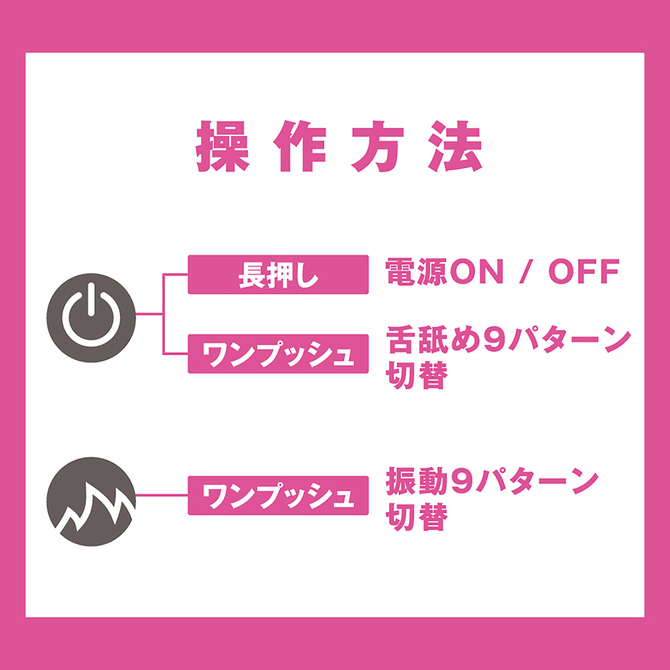 電源長押しでON/OFF 9パターンの舌舐めと9パターン振動切り替え