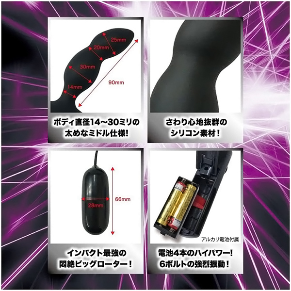 エネマボディは、さわり心地抜群のシリコン素材。ボディのラインは、二箇所のくびれがアクセントを生みますカーブデザイン。 超強烈振動がボディてっぺんまでビリビリ震える悶絶特殊構造です!「エネマミドル」は、ボディ直径14ミリ〜30ミリの太めなワイド仕様。 この太さが、アナタを満足させるはず!さらに、ハイパワーを加速させるアルカリ電池付き!パワーアップを極めた、激震刺激を体感せよ!
