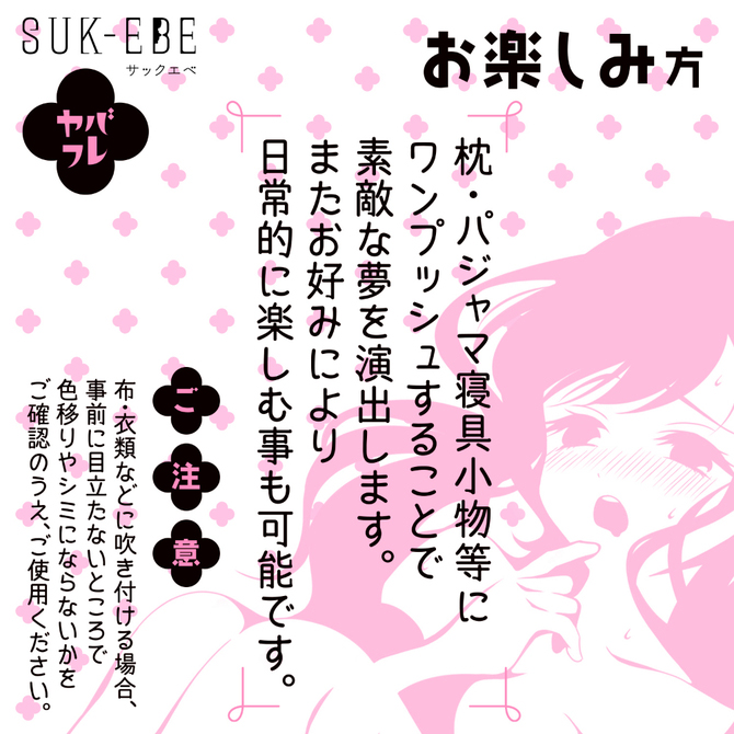大胆な時間を楽しみたい方へ。おやすみ前の夢ケアにワンプッシュ。 それがヤバフレ…アナタの夢を素敵に彩ってくれる「ヤバイフレグランス」です。 鼻孔をくすぐる新感覚のニオイ系プロダクト。あの香りがいつでもどこでもお楽しみいただけます。 嗅覚からはじまる艶やかで甘美な夢の世界をお楽しみください。 【お楽しみ方】枕・パジャマ寝具小物等にワンプッシュすることで素敵な夢を演出します。 お好みにより日常的にもお楽しみいただけます。 【ご注意】布・衣類などに吹き付ける場合、事前に目立たないところで色移りやシミにならないか確認してからご使用ください。