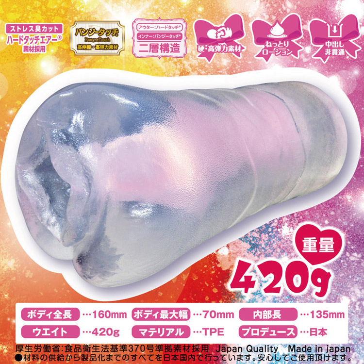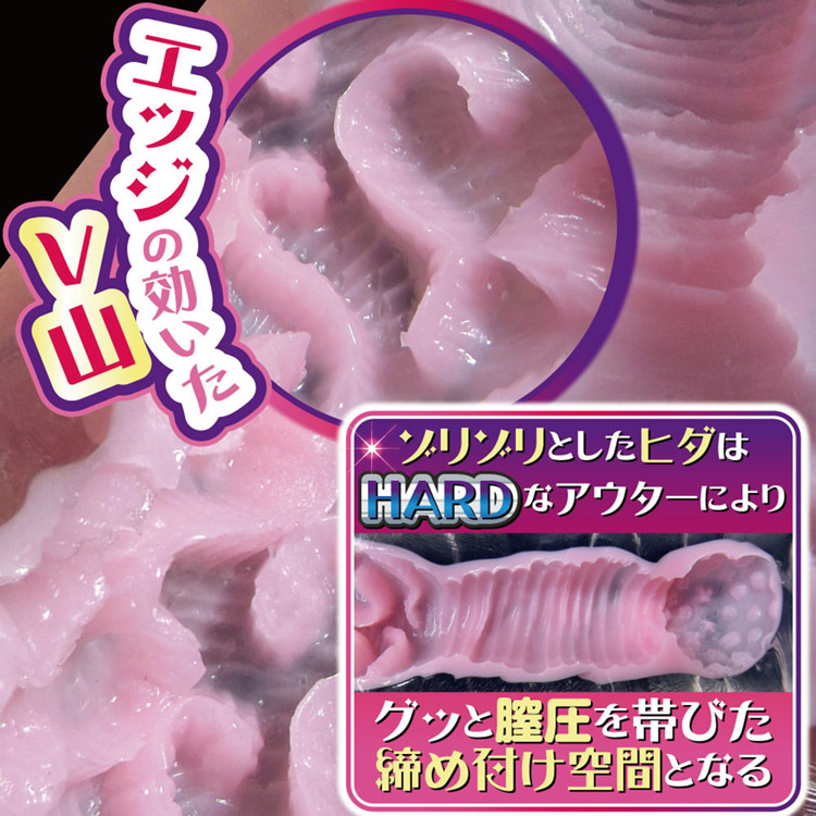 快楽迷宮歪曲空間エッジの効いたV字歪曲がストロークする度、縦横にぐにゅぐにゅとゾリ上げる。歪曲V字山が織りなす特殊な触感、歪曲空間迷宮を堪能して下さい。ソフト素材をハード素材で包むことにより内部圧を逃がす事なくギミック形状を伝達できる膣圧二層式です。ゾリゾリとしたヒダはHARDなアウターによりグッと膣圧を帯びた締めつけ空間になります。本体サイズ:全長:16.0cm/全幅:7.0cm重量:420g付属品:ローション